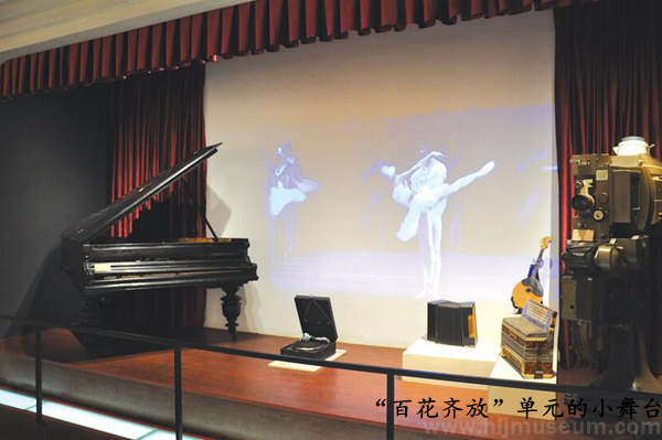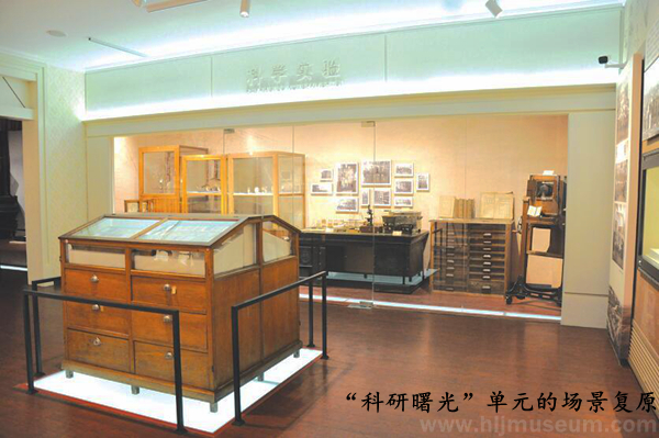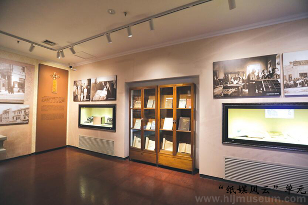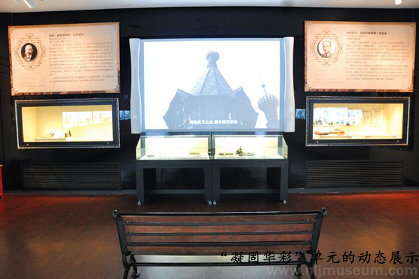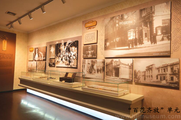 第三展厅,为“科研曙光”“百花齐放”“纸媒风云”三部分内容。展厅前段空间的“科学实验室”集中使用馆藏老柜子和老藏品,展示相关主题和博物馆历史。展厅中段,围绕“百花齐放”这一主题,通过舞台场景穿插的形式,展现俄侨丰富多彩的文化生活。“纸媒风云”单元则运用老展柜与定制龛柜相结合的形式,展示俄侨出版物。通过手机扫描二维码下载和触摸屏阅读的方式,延伸俄侨文献的展示量。