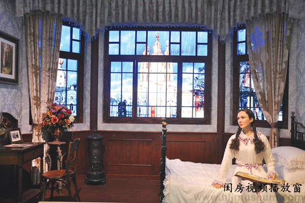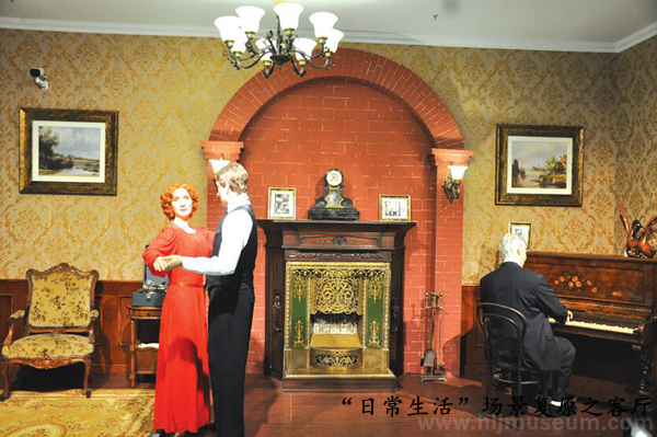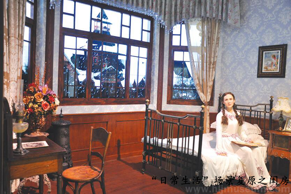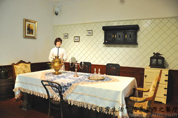 “日常生活”单元,将俄侨使用过的钢琴、沙发、壁炉、餐桌、取暖炉、茶炊、梳妆台和相册等文物与硅胶人像、艺术品相结合,复原了客厅、餐厅和闺房的场景,并将视频窗设计成卧室的窗外播放景色变化,营造了浓郁的家庭气氛和思乡情怀。