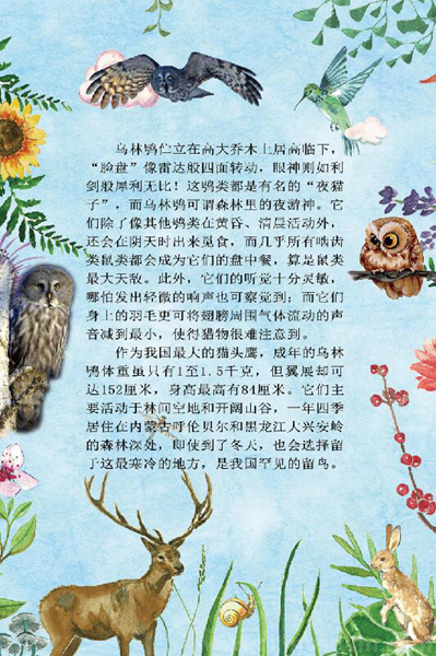 作为我国最大的猫头鹰,成年的乌林鸮体重虽只有1至1.5千克,但翼展却可达152厘米,身高最高有84厘米。它们主要活动于林间空地和开阔山谷,一年四季居住在内蒙古呼伦贝尔和黑龙江大兴安岭的森林深处,即使到了冬天,也会选择留于这最寒冷的地方,是我国罕见的留鸟。