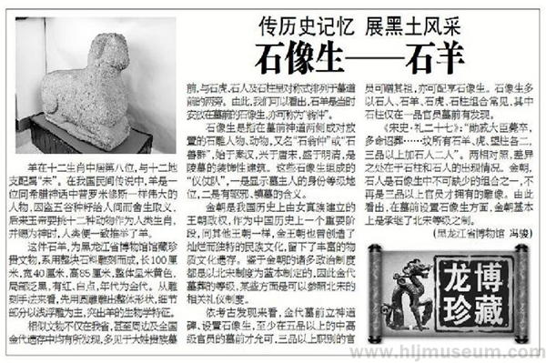相似文物不仅在黑龙江省,甚至周边及全国金代遗存中均有所发现,多见于大姓贵族墓前,与石虎、石人及石柱呈对称式排列于墓道前的两旁。由此可以看出,石羊是当时安放在墓前的石像生,亦可称为“翁仲”。