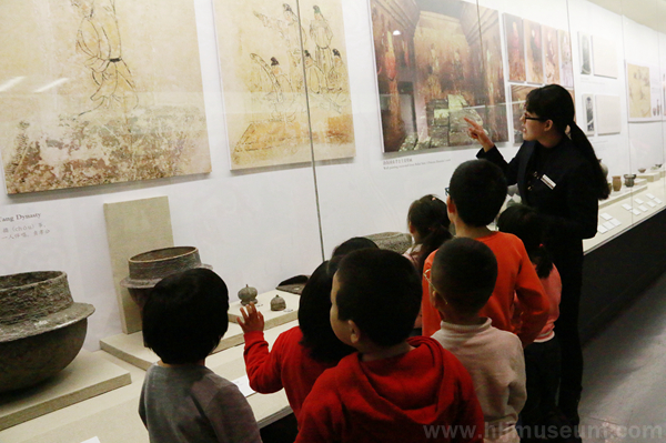 在老师的详细介绍下,小朋友们了解了许多种乐器,包括它们的历史背景、声音特点、制作材料、演奏方式等知识。老师还带领小朋友们去历史陈列展厅寻找课堂上讲到的乐器,火眼金睛的小朋友们毫不费力地找到了《乐舞图》壁画上所隐藏的乐器,并通过这幅美丽而真切的壁画,加深了对传统乐器的了解。