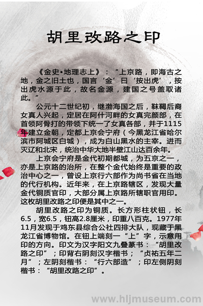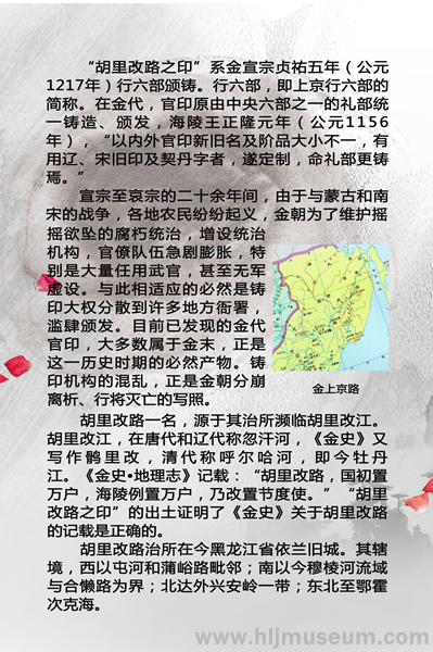 “胡里改路之印”系金宣宗贞祐五年(公元1217年)行六部颁铸。行六部,即上京行六部的简称。在金代,官印原由中央六部之一的礼部统一铸造、颁发,海陵王正隆元年(公元1156年),“以内外官印新旧名及阶品大小不一,有用辽、宋旧印及契丹字者,遂定制,命礼部更铸焉。”