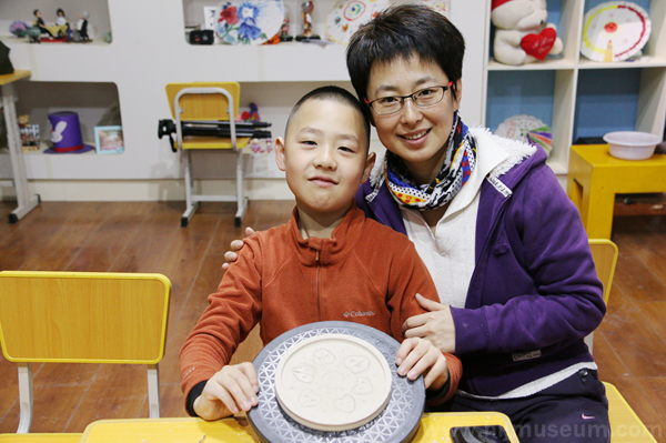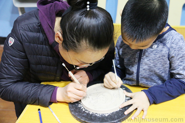 学习了基本的历史知识后,小朋友们回到教室,进入了本次活动的动手环节。在发放铅笔、转台等一系列雕刻工具后,老师就正式开始教大家动手雕刻瓦当了。在雕刻过程中,老师一边演示工具刀的使用方法,一边讲解雕刻知识,让大家了解阴刻与阳刻两种雕刻方式。在制作过程中,小朋友们都兴致勃勃地与家长一同动手雕刻莲花瓦当。不知不觉,活动就接近了尾声。看着自己动手完成的作品,小朋友们都露出了开心的笑容。