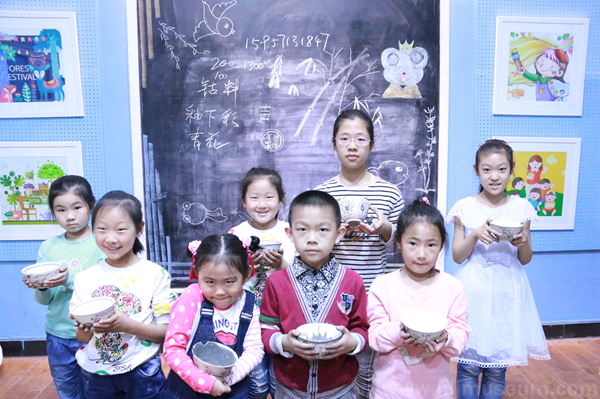在学习了瓷碗的相关知识后,小朋友们回到教室,利用毛笔、颜料等工具开启了青花大碗的制作!课程开始之初,老师介绍了制作过程中所使用的坯子与青花料。在绘画时,老师边讲授如何画竹子边为大家讲解青花瓷碗的知识。而在不知不觉中,制作青花大碗的活动接近了尾声。看着自己动手完成的作品,小朋友们那一张张小脸上都洋溢着开心的笑容。