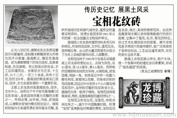 渤海国上京龙泉府建筑材料多用石料和砖瓦,有宝相花纹砖、文字瓦、莲花瓦当及各种釉瓦等,所出土的大量文物更充分显示了当年上京城的雄伟壮丽、人烟繁庶。这块现藏于黑龙江省博物馆的宝相花纹砖,于1983年在宁安县东京城渤海上京龙泉府遗址出土。此砖为灰色方形,长43.0厘米、宽42.5厘米、厚5.5厘米,用特制的坯模脱制而成,火候较高,质地坚硬,残缺一角。砖面正中饰有一双重八瓣宝相花,周围饰以花瓣。砖的四角有对称的花纹图案,四边正中分饰4个小六瓣宝相花和花叶,其完整性较为少见。渤海的方砖一般用于铺地,而宝相花纹砖因图案美观、秀丽,已成为渤海典型的建筑材料之一。