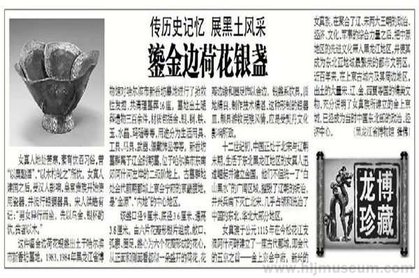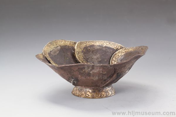 这件鎏金边荷花银盏出土于哈尔滨市新香坊墓地,现藏于黑龙江省博物馆。1983至1984年,黑龙江省博物馆对哈尔滨市新香坊墓地进行了抢救性发掘,共清理墓葬16座。墓地出土随葬遗物300余件,材质包括金、银、铜、铁、玉、水晶、玛瑙等,按用途分为生活用具、工具、马具、武器、佩戴饰品等。新香坊墓群属于辽金时期墓,位于哈尔滨市东南郊阿什河左岸的二级阶地上。古墓群地处金代前期都城上京会宁府的京畿腹地,是“金源”、“内地”的中心地区。