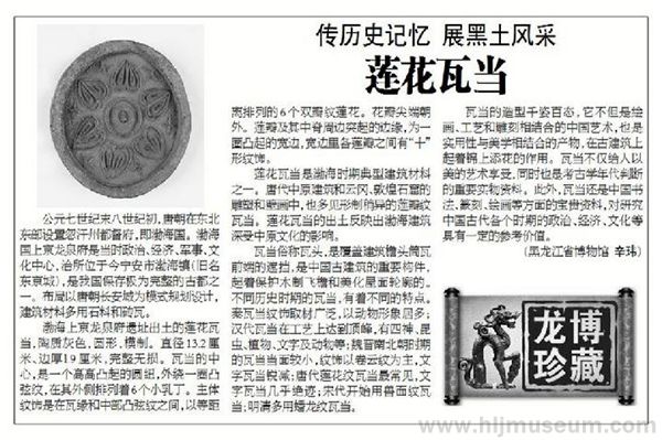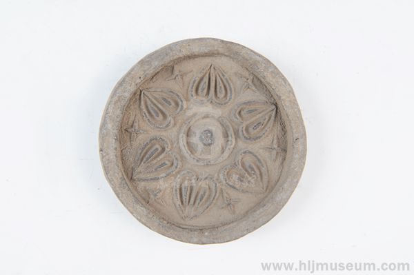 渤海上京龙泉府遗址出土的莲花瓦当,陶质灰色,圆形,模制,直径13.2厘米、边厚l.9厘米,完整无损,现藏于黑龙江省博物馆。瓦当的中心,是一个高高凸起的圆纽,外绕一圈凸弦纹,外侧排列着6个小乳丁。其主体纹饰是在瓦缘和中部凸弦纹之间,以等距离排列的6个双瓣莲花纹,花瓣尖端朝外,莲瓣及其中脊周边突起的边缘为一圈凸起的宽边,宽边里各莲瓣之间有“十”形纹饰。