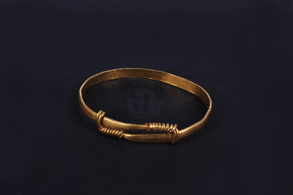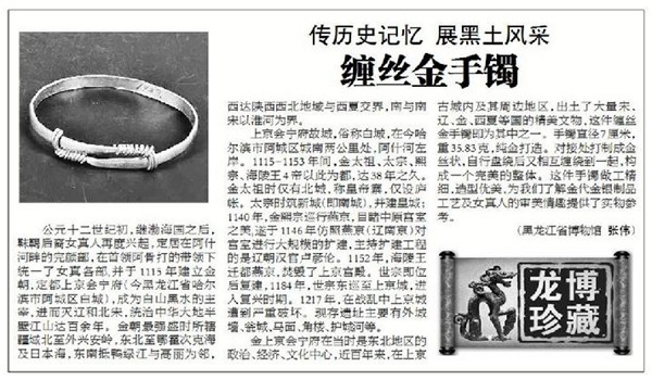 金上京会宁府在当时是东北地区的政治、经济、文化中心,近百年来,在上京古城内及其周边地区出土了大量宋、辽、金、西夏等国的精美文物,而缠丝金手镯即为其中之一,现藏于黑龙江省博物馆。它直径7.0厘米,重35.83克,纯金打造,对接处打制成金丝状,自行盘绕后又相互缠绕到一起,构成一个完美的整体。这件手镯做工精细,造型优美,为我们了解金代金银制品工艺及女真人的审美情趣提供了实物参考。