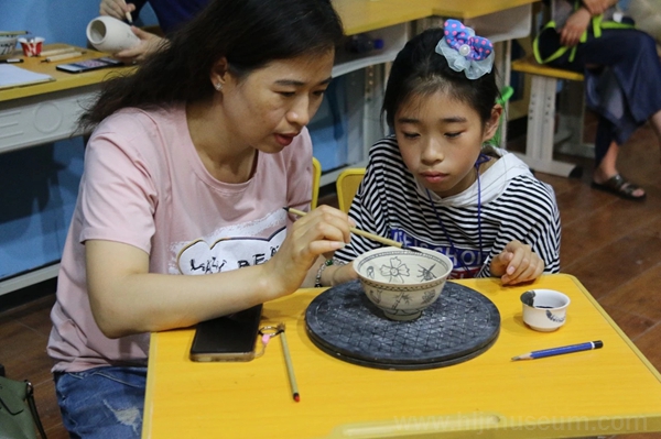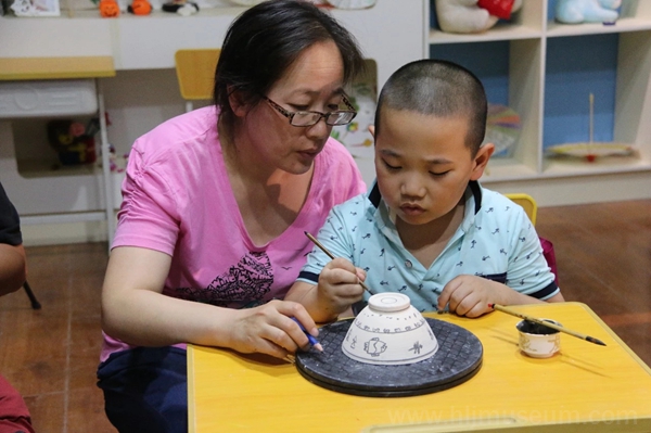 学过青花瓷的知识后,老师便给大家发放了毛笔、颜料等一系列工具,让小朋友们在瓷坯子上尽情发挥自己的才能。在每位家长的协助下,孩子们一笔笔勾画、一点点描绘,一件件作品跃然于眼前,别提多开心啦!