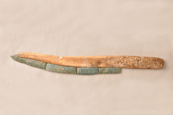 石刀全长33.5厘米,最宽处3.6厘米,石刃长24.0厘米,骨梗长31.5厘米。此刀是当时居民重要的生产、生活工具,由骨梗和绿色石片结合而成的复合工具。骨梗用兽骨磨制,前窄后宽。刀身石片呈矩形,刀尖石片呈抹斜状。石片经过压制法处理,上面留下大小不一的石片疤,从而使石器的形状变得更加规整,刃口和尖更加锋利。这种复合工具的制作技术,标志着当时黑龙江地区压制石器技术达到了很高水平。