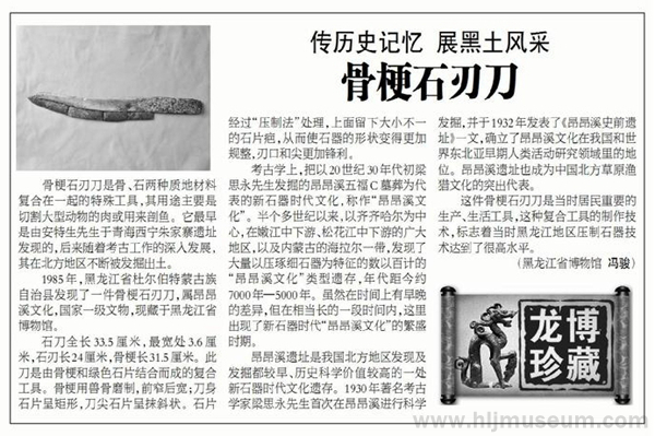 1985年,黑龙江省杜尔伯特蒙古族自治县发现了一件骨梗石刃刀,属昂昂溪文化,国家一级文物,现藏于黑龙江省博物馆。