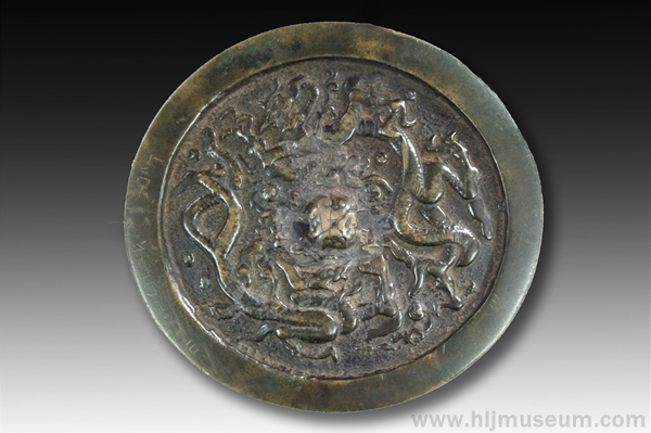 这面“上京”款双龙镜,圆形,平缘,龟形钮,装饰双龙纹,有卷云纹钮座。其直径12.0厘米,缘厚0.4厘米。缘与钮座间,双龙首尾相衔,张口,四足三爪,鳞片稀疏。卷云纹衬地,边缘有刻款,为“上京□□□□”等字,即经上京路某机构检验。龙纹作为中国古代铜镜上的装饰主题,是中国铜镜文化的一大特色。在数量上,金代的双龙纹镜仅次于极富盛名的双鱼镜。其龙纹镜受唐代的影响较大,创新也最多,常见有盘龙镜、摩羯龙纹镜等。