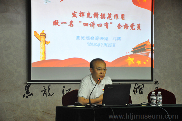 按照黑龙江省博物馆“三会一课”工作计划安排,2018年7月20日下午2点,黑龙江省博物馆党委书记、馆长王军同志在黑龙江省博物馆多功能厅以《发挥先锋模范作用 做一名“四讲四有”合格党员》为题作学习教育专题党课。黑龙江省博物馆领导班子成员、党支部各位支委委员以及全体党员参加。