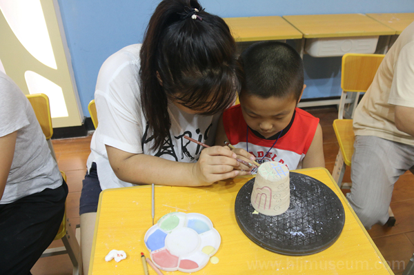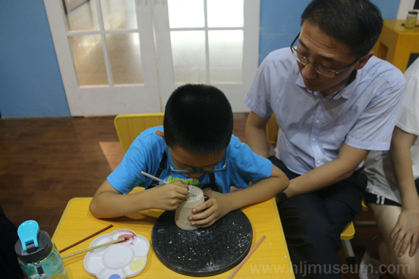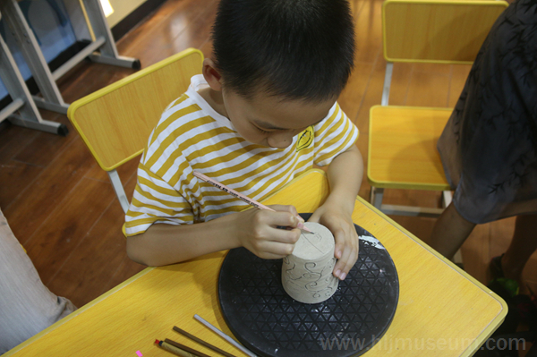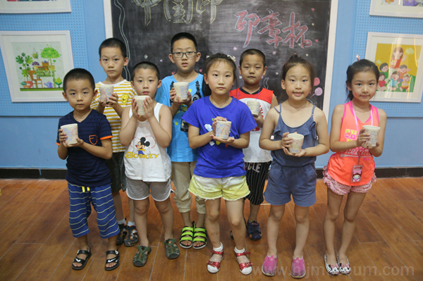 本次活动刻印的主体是印章杯。老师一边演示工具刀的使用方法,一边为大家讲解雕刻知识,让大家了解阴刻与阳刻两种雕法。而小朋友需要使用铅笔将所刻的字写在杯底,再用工具进行雕刻,最后将颜料填充进刻好的字里,这样,印章杯就制作好了。