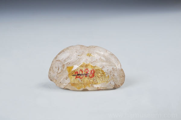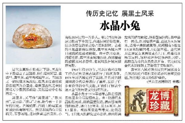 这件收藏于黑龙江省博物馆的水晶小兔为1974年黑龙江省考古队在绥滨县奥里米金墓发掘出土。其由1块透明水晶精雕而成,料质晶莹剔透,表面留有磨蚀的痕迹,通高2.2厘米、长3.6厘米、厚1.1厘米。整体图案造型考究,比例适当:1只肥大的野兔呈卧息状,体内布满发光的结晶颗粒,恰似繁星闪烁;背中部有一圆孔,四周磨损严重,直径为0.25厘米,适用于悬挂或佩带;底部雕有3处宽0.3厘米的横凹槽,1处竖凹槽。金代黑龙江地区女真贵族素有用玉、玛瑙和水晶等原料琢雕成各种装饰品的习俗,此物当为金代女真贵族所有,它为研究金代水晶雕刻工艺提供了实物资料。