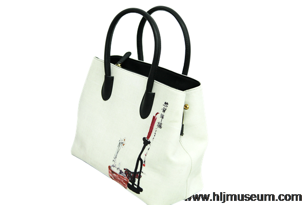黑龙江省博物馆的馆藏精品书画——《恭贺年禧图》,是潘天寿先生60岁在杭州所作。画中的红烛、鞭炮、水及“恭贺年喜”四字,充分传达了作者庆祝节日的欢乐心情。这件亚麻手提包将书画作品重新设计和构图,色彩明快艳丽,装饰典雅大方,将女性极为寻常的日常饰品赋予中国传统绘画的文化内涵,深受女性朋友的喜爱。