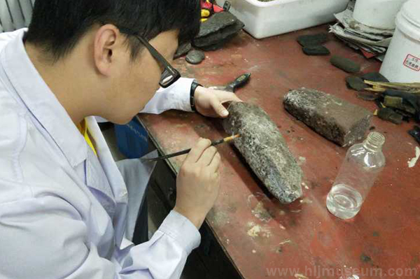 文保中心专业人员在此阶段文物复制工作中,历时5个月的时间,克服了种种困难,如复制时填充起泡等技术性的难题以及修复室炎热酷暑等环境考验,成功为哈尔滨市第六十中学复制文物64件、为鄂温克旗博物馆复制文物3件、为伊春桃山博物馆复制文物3件、为饶河农垦博物馆复制文物8件,文物类别涉及玉器、石器、骨制品、铜印、金牌等多个门类。文物复制主要使用锡条、树脂、石膏、聚甲基丙烯酸甲酯、玻璃钢、氧化钠、硫酸铜等物理和化学材料,通过清洁除尘、涂刷脱模剂、硅胶翻模、石膏翻模、养护、脱模、注入填充材料、精修、上色、外层防护等步骤完成整个修复过程,复制成品尺寸精准,外观形象具有极强的相似度。
