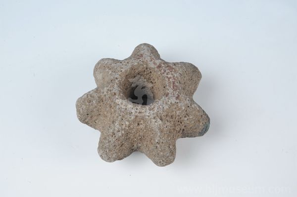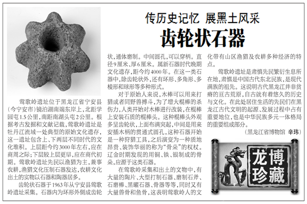 这件齿轮状石器直径9厘米、厚6厘米,于1963年从宁安县莺歌岭遗址采集,现藏于黑龙江省博物馆。石器内为环形外侧成齿轮状,通体磨制,中间圆孔,可以穿柄。该件石器属新石器时代晚期文化遗存,距今约4000年。在这一类石器中,除齿轮状者外,还有环形、多角形、多棱形和球形等多种形式的。