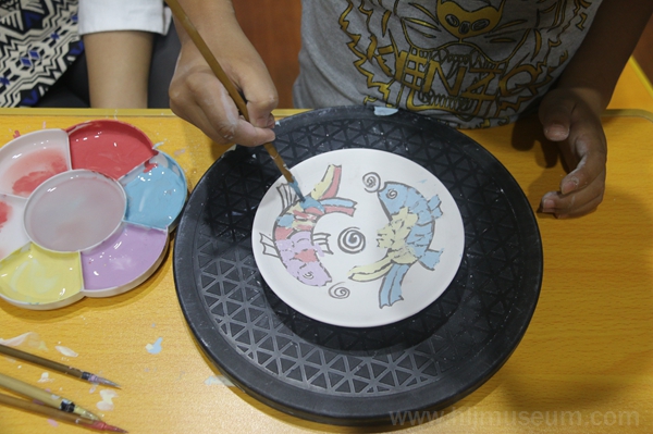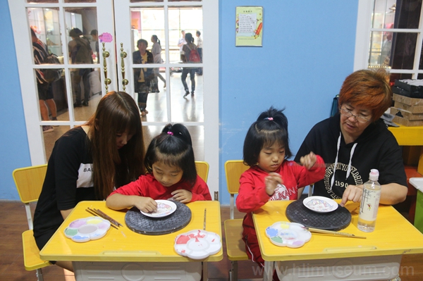 回到教室,老师在把事先准备好的一份份材料和制作工具分发给孩子们后,他们便跃跃欲试地“动”起手来。通过拓稿、描轮廓、平涂颜色、细节处理等步骤,家长和小朋友们一起手绘双鱼纹彩色陶瓷盘。然而,现场手绘只是制作双鱼纹彩色陶瓷盘的部分环节,因为这些陶瓷盘还要经过烧制,才能成为最终完整的作品。