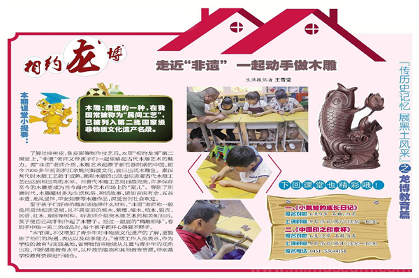 了解过桦树皮、鱼皮画等制作技艺后,“相约龙博”第二课堂上,非物质文化遗产木雕工艺的老师又带孩子们一起领略起古代木雕艺术的美丽与魅力。