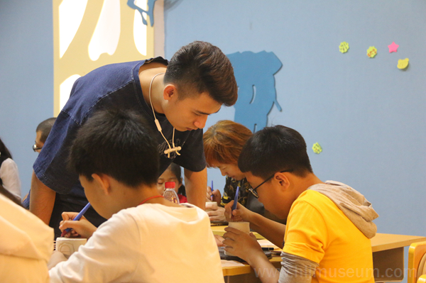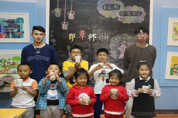 课程一开始,小朋友们就在老师的讲述中了解到印章的历史、制作工艺流程、雕刻技法及用途等知识,充分满足了他们的好奇心和求知欲望。随后,老师便正式教孩子们印章杯的制作。只见他边演示工具刀的使用方法,边为小朋友们讲解雕刻知识,这不仅让大家了解了阴刻与阳刻两种雕法,也让他们学习到了在古时没有现代设备的环境下,人们是如何制作雕刻印章的。手工制作时,小朋友们先学习了自己名字的篆体写法,然后用铅笔小心翼翼地在杯子底部写上自己的名字,并在老师的“注意安全”提示下与家长们一同顺利完成了雕刻环节。最后,孩子们运用色彩点缀装饰了各自的印章杯,这样,一件件艺术品就制作完成了。