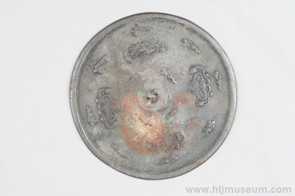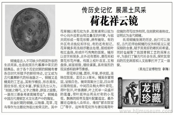 这面藏于黑龙江省博物馆的荷花祥云镜,圆形,平缘,桥状纽,连珠纹纽座,直径21.5厘米。镜面含富锡层,呈银白色。镜背图案分三层:四朵祥云围绕纽座;中间四朵稍大带叶荷花,荷叶张开,叶脉清晰,叶上托举一朵盛开的莲蓬,荷叶底伸出两朵对称的小花苞,飘拂的绶带及莲叶配置适宜;最外圈近边缘处有八朵祥云。镜背边缘还刻有“都右院官□”等字。这种荷花纹饰与唐双鸾荷叶纹镜的荷花纹饰相同,但刻款和连珠纹,证明此为金代铜镜。