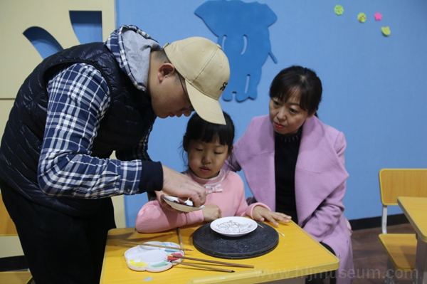 学习过有关金代铜镜的知识后,小朋友们回到教室,开始动手绘制陶瓷盘。只见一份份材料和制作工具已摆放在大家面前,小朋友们与家长仅需通过拓稿、描轮廓、平涂颜色、细节处理等步骤就可以完成手绘工序了。然而,完成手绘工序也只是制作工序的一半,这些漂亮的陶瓷盘还要经过烧制,才能成为最终完整的作品。