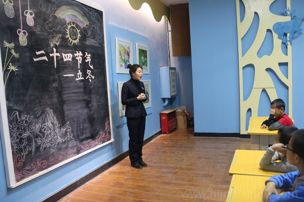 首先,老师带领同学们了解立冬的时间、含义、气候特点等知识。立冬时期会出现雾霾天气,老师便就此讲述了雾霾的形成原因、雾霾与立冬的关联,同学们也十分踊跃地回答自己了解的有关雾霾的知识。