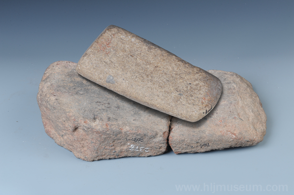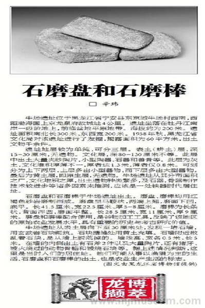 黑龙江省博物馆所收藏的石磨盘和石磨棒于牛场遗址出土。磨盘、磨棒均用红褐色砂岩磨制而成。磨盘呈马鞍状,两端上翘,磨面下凹,底平,长41.5厘米、宽22.5厘米、厚5.0厘米至8.0厘米。磨棒为长条状,背面浑圆,磨面平整,长28.5厘米、宽11.0厘米、厚9.0厘米。磨盘和磨棒配合使用,是谷物加工工具,反映了该地区的原始农业发展水平,具有重要的历史与考古研究价值。