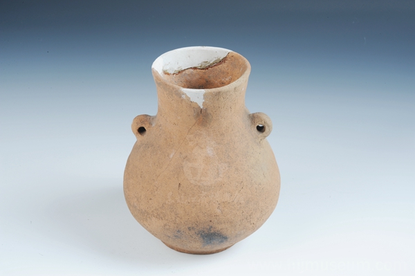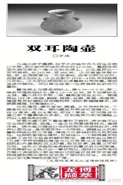 这件藏于黑龙江省博物馆的双耳陶壶,口径10.0厘米、高25.8厘米,底径,7.0厘米。其腹大直颈,圆肩,上方两侧有耳,下腹急收成小平底,颈内壁至外表涂红色陶衣。红衣陶占大道三家子墓葬绝大多数,红彩是预先刷在陶胎上然后入窑烧制而成。