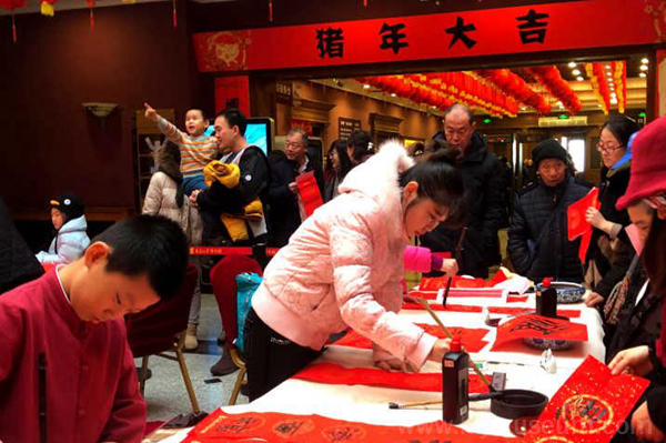 千门万户瞳瞳日,总把新桃换旧符。贴春联,是民间烘托“年味儿”的一项重要年俗。春联不仅寓意着人们对农历新年的美好愿望,更沉淀了中华民族数千年的文化底蕴。2019年1月29日上午,黑龙江省博物馆举办的“挥毫泼墨送春联——省内知名书法家现场笔会”为2019年“黑土地上迎新春 博物馆里过大年”系列活动拉开了序幕。黑龙江省书法家协会会员、黑龙江省妇女书法家协会会员、哈尔滨学院书法教授等省内众多知名书法家齐聚博物馆,共同为观众现场书写春联和“福”字,并免费赠送给现场观众。大红的洒金宣纸,笔端晕染开的翰墨气息,浓缩了书法家们对市民朋友们的真诚祝福,也表达了他们对家乡和博物馆的深情厚谊。