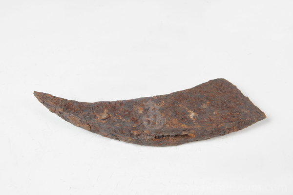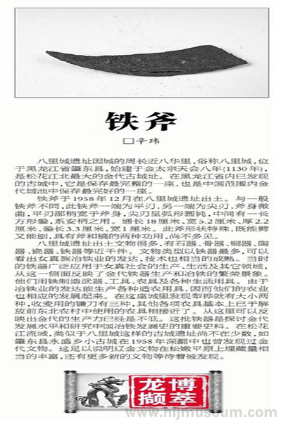 黑龙江省博物馆所藏的这件铁斧于1958年12月在八里城遗址出土。与一般铁斧不同,此铁斧一端为平刃,另一端为尖刃,斧身微曲,平刃部稍宽于斧身,尖刃呈弧形圆钝,中间有一长方形銎,系安柄之用。其通长18.0厘米、宽5.2厘米、厚2.2厘米、銎长3.3厘米、宽1.0厘米。铁斧形状特殊,既能劈又能刨,具有斧和镐的两种功用,尚不多见。