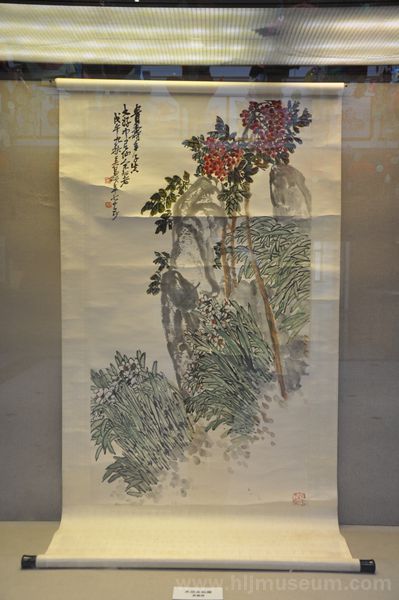此作是1964年由北京故宫调拨而来,是吴昌硕先生作于1918年秋,属于先生晚年成熟时期的花卉精品。画心长152厘米 宽 82.5厘米 。以水仙比喻清雅,就花鸟画科而言,缘物抒情的表现方式是传统的,而在绘画技法上吴昌硕则以强烈的个人风格完成了自我表达。
