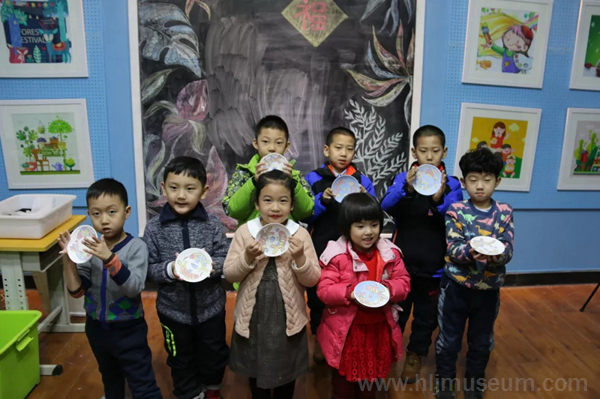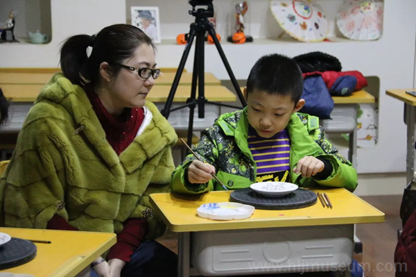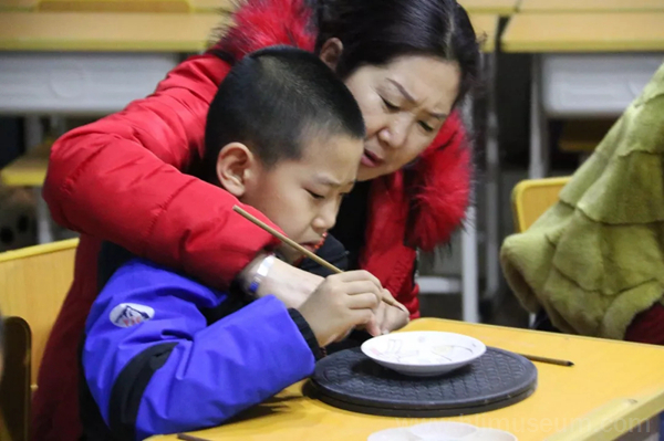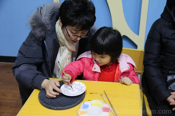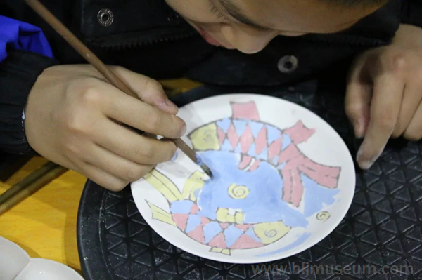 课程以金代双鱼纹大铜镜为核心展开。鲤鱼因为它强大的繁殖能力而有着“多子多孙”的美好寓意,又因为它还有“鲤鱼跳龙门”的教育意义而得到女真人的重视,因此,镜子背面刻画的双鱼纹是女真族十分喜爱的样式。课堂上,老师把事先准备好的一份份材料和制作工具分发给孩子们,并教他们通过拓稿、描轮廓、平涂颜色、细节处理等步骤来手绘双鱼纹彩色陶瓷盘。小朋友们一边进行着手绘活动,一边享受着与妈妈共同完成一件事情所带来的快乐。然而,单纯的手绘活动也只是手绘双鱼纹彩色陶瓷盘制作工序的一半,因为陶瓷盘还需经过烧制才能成为完整的作品。