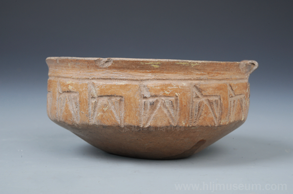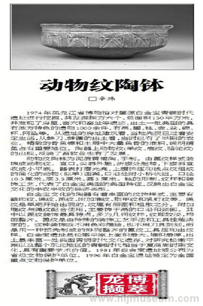 这件动物纹陶钵为泥质黄褐陶,手制,口径10.5厘米、底3.5厘米、高5.0厘米,现收藏于黑龙江省博物馆。它由篦(bì)纹样式装饰成动物纹,直口,尖唇外撇,折腹处起棱,下腹斜直收成小平底。其器表打磨光亮,上腹饰压印线点纹组成的简化的动物(似羊)图案,口沿处附小桥状纽。钵的形制、纹样和装饰工艺,代表了白金宝类型的典型特征,反映出白金宝文化的半农半牧的经济类型。