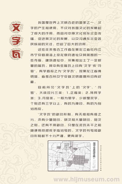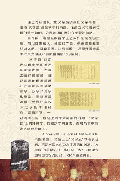 这些年来考古工作者在黑龙江省牡丹江市宁安县渤海上京龙泉府遗址及其周围的一些寺庙、建筑遗址中,采集和出土了一定数量的陶瓦。其中有些陶瓦上印有“文字”或“符号”,有学者称之为“文字瓦”,现黑龙江省博物馆、省考古所及宁安县文物管理所均有收藏。
