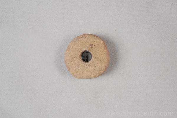 有的考古学者将这两件圆孔小陶饼称之为“陶纺轮”。纺轮形状和材质多样,特征也同样明显:平面一般呈圆形,在圆心位置有纵向的贯穿孔,剖面形状多样,呈长方形、扁鼓形、半圆形、双锥形等。有些用陶器残片打磨的中心钻孔的圆陶片也被普遍认为是纺轮。但是在人类学视角下,这种纺轮状器物也有着和纺纱毫不相关的多种用途,如猎物系挂扣、器盖、塞子、纽扣、玩具等。