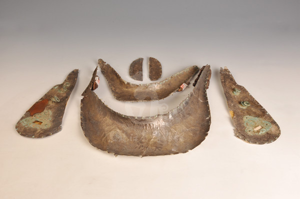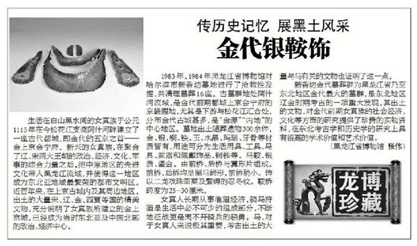 1983年、1984年黑龙江省博物馆对哈尔滨市新香坊墓地进行了抢救性发掘,共清理墓葬16座。古墓群地处阿什河流域,是金代前期都城上京会宁府的京畿腹地,尤其是下游与松花江汇合处,分布金代古城甚多,是“金源”、“内地”的中心地区。墓地出土随葬遗物300余件,金、银、铜、铁、玉、水晶、玛瑙、牙骨等材质皆有,用途可分为生活用具、工具、马具、武器和佩戴饰品、铜钱等。这件银鞍饰即为其中一件。它银质鎏金,由前桥、后桥与翼形片组成。前桥与后桥均呈倒马蹄形,前桥稍小,饰以二龙戏珠图案及繁缛的忍冬纹。鞍桥跨度为25厘米至30厘米。