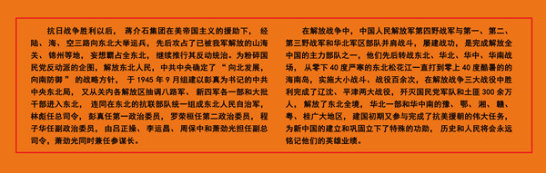 在解放战争中,中国人民解放军第四野战军与第一、第二、第三野战军和华北军区部队并肩战斗,屡建战功,是完成解放全中国的主力部队之一,他们先后转战东北、华北、华中、华南战场,从零下40度的东北松花江一直打到零上40度酷暑的的海南岛,实施大小战斗、战役百余次,在解放战争三大战役中胜利完成了辽沈、平津两大战役,歼灭国民党军队和土匪300余万人,解放了东北全境,华北一部和华中南的豫、鄂、湘、赣、粤、桂广大地区,建国初期又参与完成了抗美援朝的伟大任务,为新中国的建立和巩固立下了特殊的功勋,历史和人民将会永远铭记他们的英雄业绩。