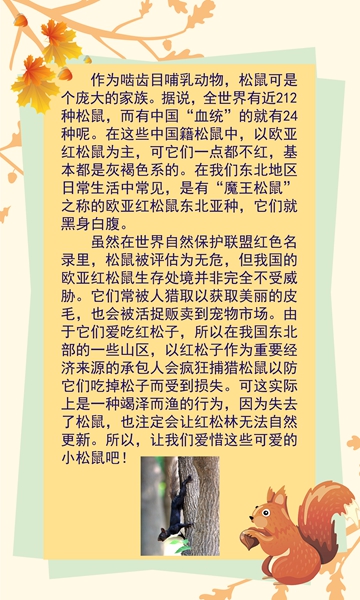 虽然在世界自然保护联盟红色名录里,松鼠被评估为无危,但我国的欧亚红松鼠生存处境并非完全不受威胁。它们常被人猎取以获取美丽的皮毛,也会被活捉贩卖到宠物市场。由于它们爱吃红松子,所以在我国东北部的一些山区,以红松子作为重要经济来源的承包人会疯狂捕猎松鼠以防它们吃掉松子而受到损失。可这实际上是一种竭泽而渔的行为,因为失去了松鼠,也注定会让红松林无法自然更新。所以,让我们爱惜这些可爱的小松鼠吧!
