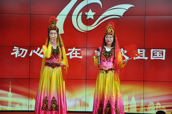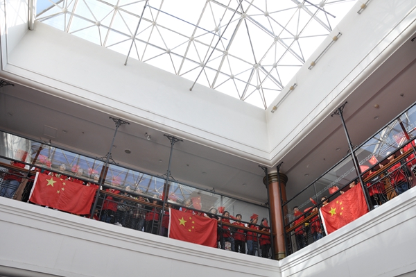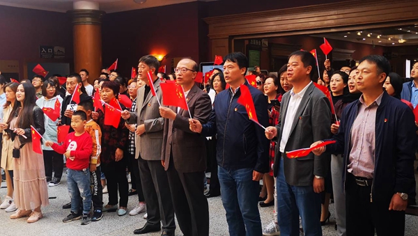 他们手持国旗在阳光大厅及自然展厅、历史展厅、俄侨展厅、邓散木展厅、于志学展厅分组共同演唱《我和我的祖国》《歌唱祖国》《没有共产党就没有新中国》,以歌唱形式庆祝中华人民共和国成立70周年,场面十分震撼,博物馆阳光大厅瞬间成了一片歌的海洋。与此同时,博物馆还在大厅邀请观众演唱《龙的传人》《我的中国心》《大中国》等爱国歌曲,他们挥舞着国旗,高声合唱着。歌声渐渐吸引了更多人,许多观众也情不自禁地参与其中,加入到了合唱的队伍之中。