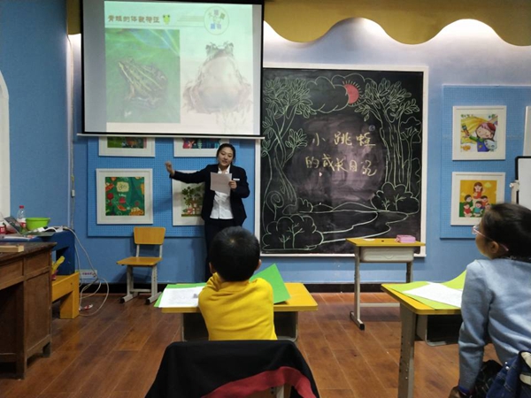 在课程开始前,小朋友们通过角色扮演的形式,重温了曾经听过的《小蝌蚪找妈妈》的故事,并从故事中知道,小蝌蚪生活在水里,用鳃呼吸,用鳍游泳。随后,孩子们又通过观察老师准备的图片,知道了青蛙是两栖动物,用肺和皮肤呼吸,捕捉害虫。在倾听了青蛙的叫声后,小朋友们知道了原来青蛙的英文单词“frog”,是模仿青蛙叫声而来的。