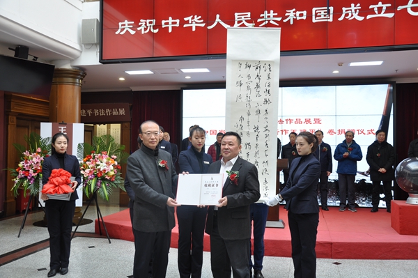 为庆祝中华人民共和国成立70周年,弘扬中华民族优秀传统文化,丰富广大观众文化生活,2019年11月14日,王建平书法作品展暨《中国当代书法名家新作王建平》卷捐赠仪式在黑龙江省博物馆隆重举行。