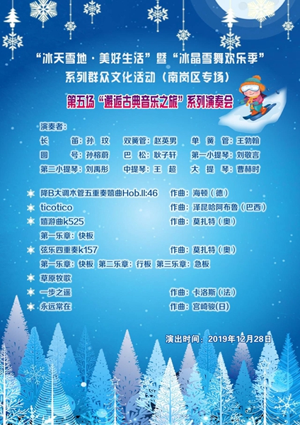 为深入贯彻落实习近平总书记关于“坚定文化自信,推动社会主义文化繁荣兴盛,深入实施文化惠民工程,丰富群众性文化活动”的指示精神,进一步丰富第36届哈尔滨国际冰雪节和2020年元旦、春节期间群众的业余文化活动,在哈尔滨市广大市民中积极倡导健康向上的节庆纪念文化活动和生活方式,2019年12月28日,由黑龙江省文化和旅游厅、哈尔滨市文化广电新闻出版局主办,南岗区文体旅局和南岗区文化馆承办的“冰天雪地 美好生活”系列群众文化活动之“邂逅古典音乐之旅”演奏会在黑龙江省博物馆隆重举行。