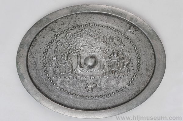 黑龙江省博物馆有一件许由巢父故事铜镜,其圆形、圆钮、平缘,直径21.2厘米、缘厚1.0厘米,镜面呈银白色,过去称之为“水银古”,其实是一层含有铜、铅、铝、钙、钾等多种元素的富锡,似一层透明薄膜,既保护镜体,又增加亮度。镜背图案边缘是一周凸弦纹和连珠纹。钮的上部,为起伏的山峦,中间有一棵参天大树,左侧一位老翁席地而坐,似双手合握胸前,向右观望,右侧一童子,左手牵牛,右手伸向老翁;下部河岸蜿蜒,碧波涟漪,奇石林立。