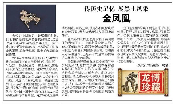 1963年在阿城半拉城子(今黑龙江省哈尔滨市阿城区半拉城子),农民挖土时发现一件金凤凰和一套金带銙,现收藏于黑龙江省博物馆。而其中这件金凤凰长5.0厘米、宽3.5厘米、重