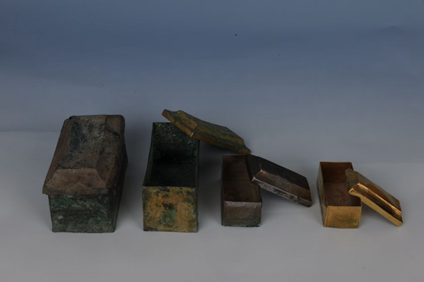 在黑龙江省博物馆众多瑰宝中,收藏有这么一组在渤海国上京龙泉府遗址出土的舍利函,其发掘时最外层为一石函。舍利函一共4件,函体为素面,呈长方形,函盖呈圆弧状梯形凸起,自外而内依次为铜函、银函、金函,层层缩小,相互套合。其中,铜函两件,一件长14.5厘米、宽8.8厘米、高8.0厘米,一件长13.0厘米、宽5.3厘米、高6.6厘米;银函一件,长9.2厘米、宽5.6厘米、高5.0厘米;金函一件,长8.3厘米、宽5.3厘米、高4.2厘米。舍利函中属银函造型最精巧,其顶部盖上刻有“祥云”,象征“净天”,四壁上的“天王”形象脚踏“二怪”,勇武有力,视为“辟邪”。此外,银函里还装有桃形银瓶。