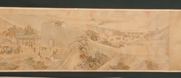 《西域舆图长卷》纸本、设色,全长18.2米、宽0.52米,画心长15.1米、宽0.485米,长度近乎为清明上河图的3 倍,较藏于辽宁博物馆徐扬的另一幅洪篇巨制——《姑苏繁华图》(亦名《盛世滋生图》)长出近3米。其中所绘汉维各族人物近400名,马匹200多, 骆驼、羊、牛等牲畜百余头,此外还有众多各色建筑、桥梁、山川、树木、河 流等等。 画上钤有“石渠宝笈、三希堂精鉴玺”等10方清宫廷内府印。画面主题突出,布局构图合理,用笔苍劲。此画以采玉为主题,卷首至卷尾描绘了嘉峪关至新疆和田之间运送和田玉以及和田河中采玉人采玉等场景的画面,沿途各地山川地理、奇阙险隘、车马行旅、水草牧放、河西坦途、天山外风光、汉族、维吾尔族等各族人民生产生活景况尽收画中。令人瞩目的是卷尾部分,远处昆仑山高耸挺拔,近处采玉人在和田河中采玉,河岸上则是穿着官服的清朝官员在监督采玉人采玉。此画是清乾隆年间的现实主义艺术佳作,具有极高的艺术价值和历史价值。