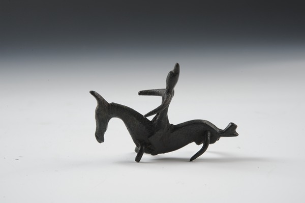 在黑龙江省博物馆所藏的诸多珍宝中,有这样一件唐代渤海国时期文物,将渤海人打马球时的飒爽英姿表现得淋漓尽致。这便是1977年10月出土于黑龙江省东宁县团结遗址的骑马铜人。它长6厘米、高5厘米,马的两前腿和尾尖处稍残。马的耳朵耸立着,似在聆听主人的口令;双眼瞪视,鼻孔微张,神情严肃;低头引颈,四肢微微向前,臀部后坐,形如突然止步;马尾似剪刀,像被束成了结。马上人物头戴幞头,面部模糊,上身直立坐于鞍上,双臂上下伸展,像在操控着什么,双腿呈“工”字形紧紧夹住马腹。