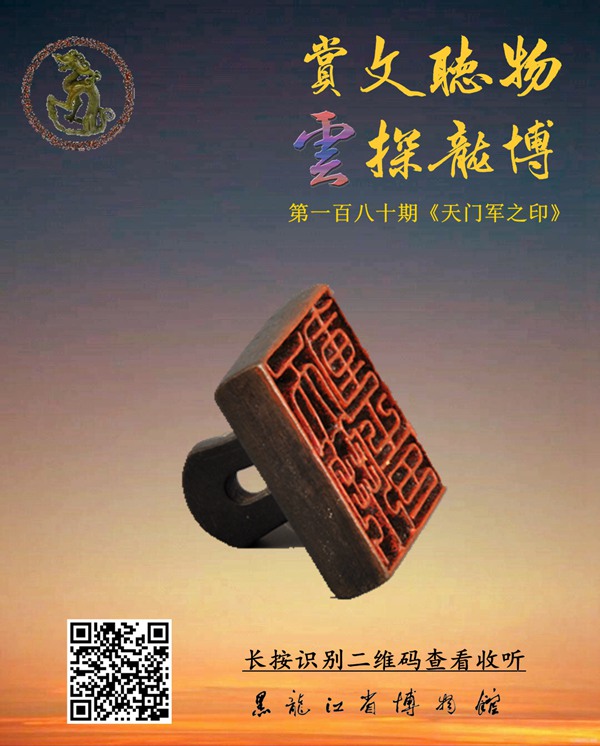 该印为一方渤海国官印,具有很高的历史研究价值。其为青铜质,铜片镶成,印纽扁平,中穿一圆孔,呈桥状,通高4.3厘米、长5.3厘米、宽5.25厘米、厚1.4厘米、柄高2.9厘米。印面略呈正方形,印文为汉字篆刻“天门军之印”;印背楷书“天门军之印”,印文凸起,用笔细挺有力,圆润活泼,笔画间形成0.9厘米的沟槽。